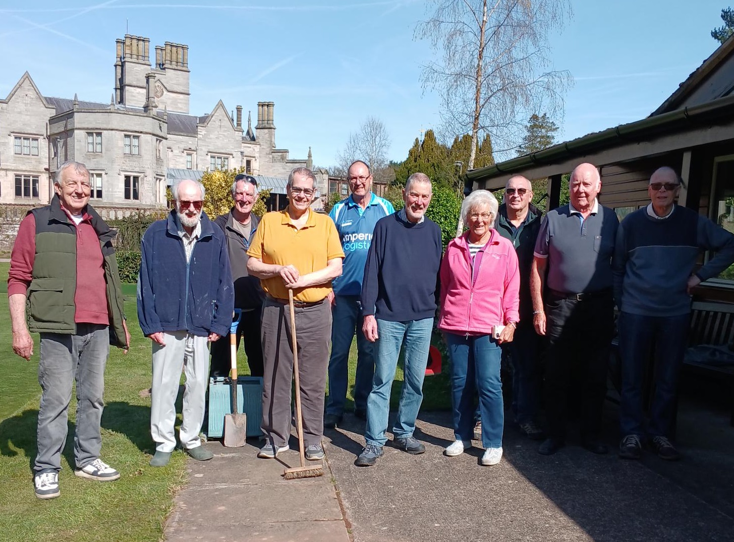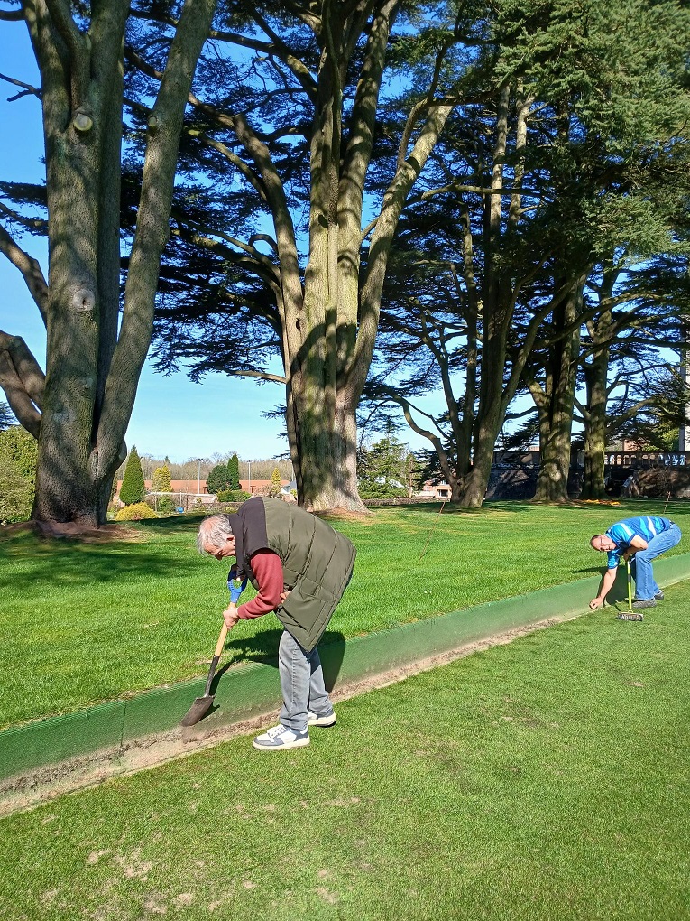 A bright sunny morning saw a party of enthusiastic members gather at the green to start preparation for the new season. The equipment shed was empied, cleaned and tidily refilled, and ditches were prepared. Clubhouse cleaning follows shortly.