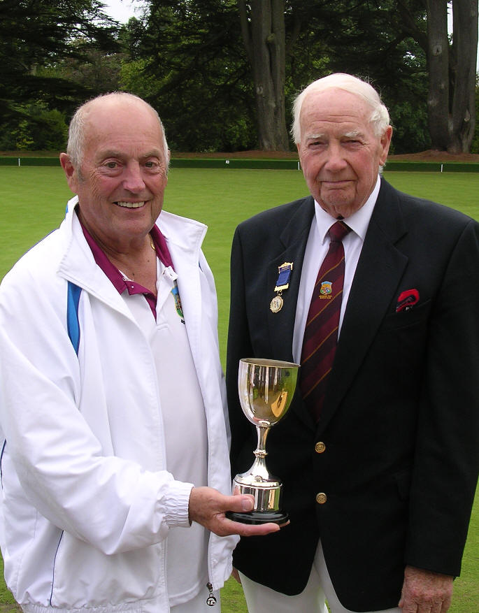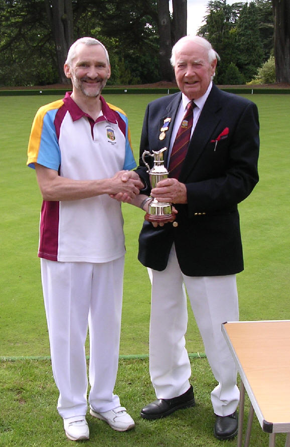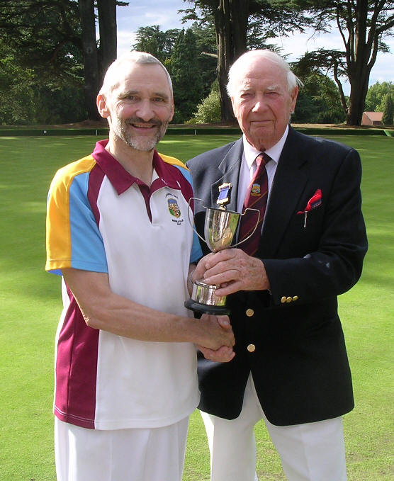 This match saw pairs partners Quentin Smith and Mike Caird playing for the cup Mike himself donated to the club in 2003. Quentin started well and led by 10-6 after eight of the nine ends of the first set. Even then he almost contrived to drop a four on the last end - and was only saved by the umpire's measure on Mike's fourth bowl! Mike rallied in the second set and took it comfortably (9-3) to level the match and force the three end tie-break. Quentin won the first end courtesy of a fortunate rub against a short bowl which guided his slightly wayward delivery back on track. Mike took the second end to force a one-end shoot-out which Quentin just edged.