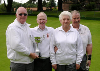 A Lilleshall rink came out on top in the Shropshire Rinks competition held at Lilleshall on 5 August. David James, Peter Preston, Ruth Lowe and Rod Payne (skip) lost only one game in the round-robin stage of the competition, which was enough to get them into the final, in which they beat a rink from St.Michael's. (August 2007)
