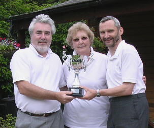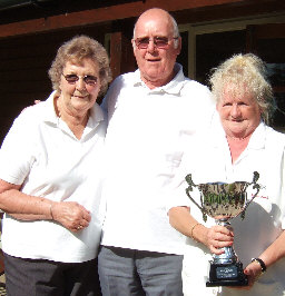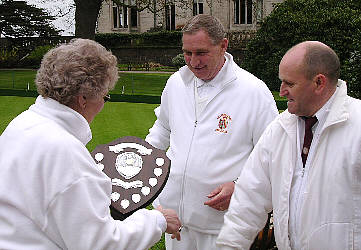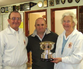 President Pauline Scott presents the pairs shield to Grenville Watton (centre) and Russell Stevenson |