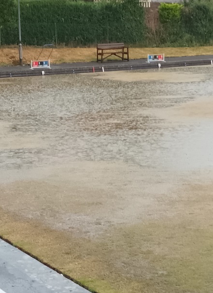 The Club's away game at Llansantffraid on 8 July had to be abandoned as a heavy thunderstorm appeared just as players were taking to the green. The deluge left the surface unplayable, so an early tea was taken and the raffle drawn. Captain Sheila drew the first ticket, and picked one of our members - Les. He drew the second ticket - Sheila's! Finally Sheila drew the last ticket and picked one belonging to Vice-Captain Bill Greenway!